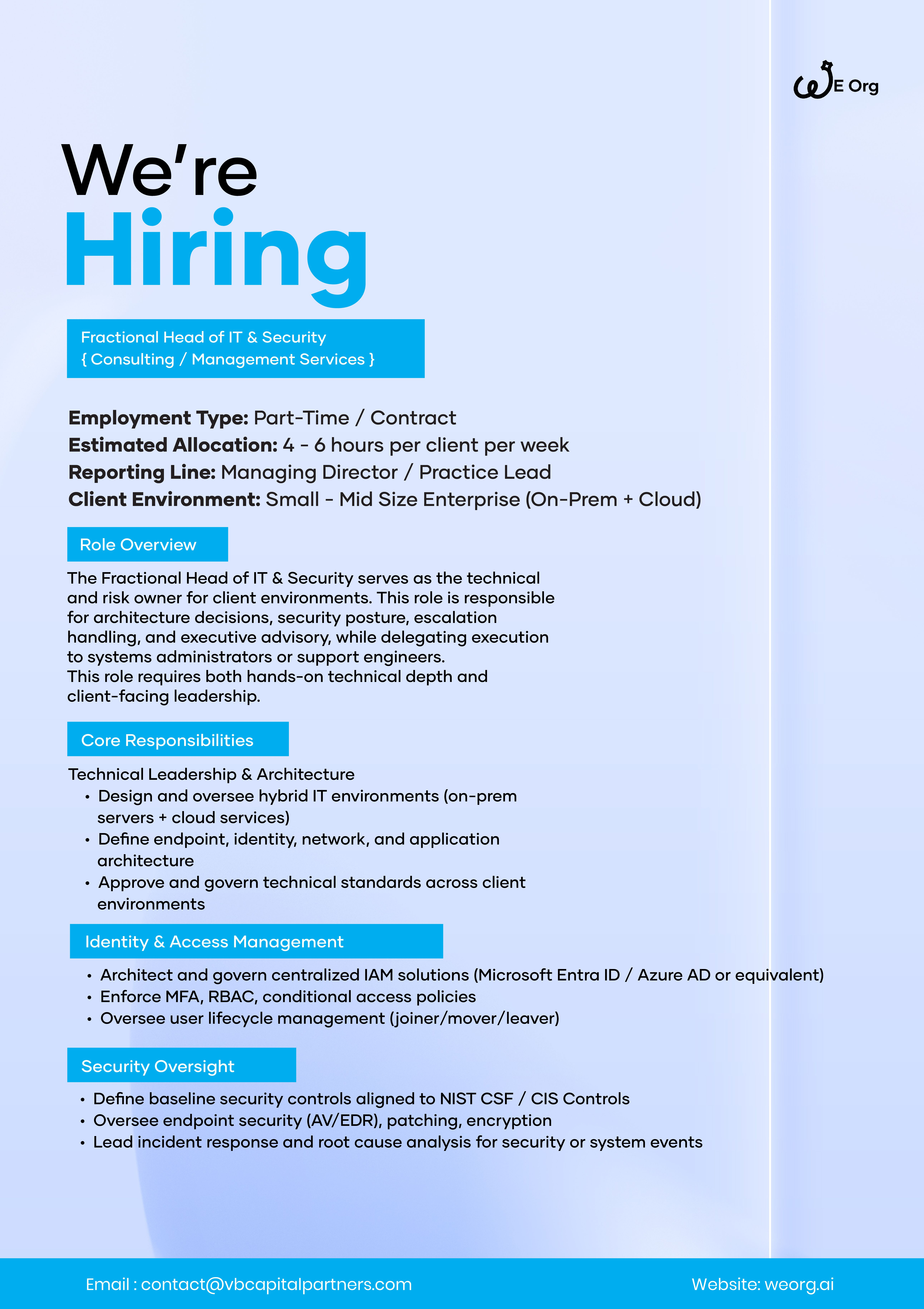 Lead our IT infrastructure and security strategy on a fractional basis. Oversee systems architecture, implement security protocols, and guide our technology roadmap.